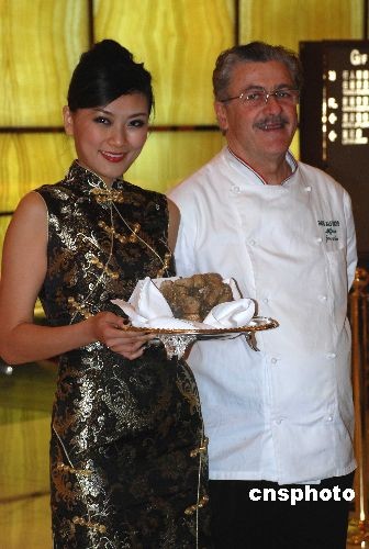 11月29日晚,在澳門、倫敦、羅馬和阿布扎比衛(wèi)星連線意大利白松露菌慈善拍賣會(huì)上,澳門博彩股份有限公司行政總裁何鴻燊以20萬(wàn)美元拍得最大的一顆白松露菌。圖為禮儀小姐和廚師在澳門會(huì)場(chǎng)展示重1.08公斤的本年度“松露王”。中新社發(fā) 畢永光 攝