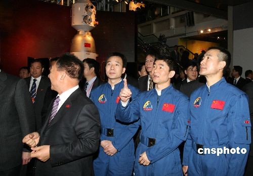 十二月六日,“中國首次太空漫步航天展”在香港科學(xué)館揭幕,神舟七號返回艙、航天服和航天員出艙后所展示的國旗等珍貴展品和圖片在展會上亮相。香港特區(qū)政府政務(wù)司司長唐英年、神舟七號載人航天飛行赴港代表團團長暨中國載人航天工程副總指揮張建啟、神七航天員翟志剛、劉伯明、景海鵬等出席揭幕儀式。中新社發(fā) 武仲林 攝