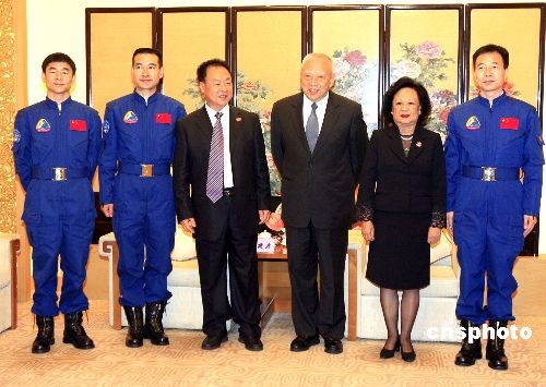 十二月六日,全國政協(xié)副主席董建華在中央人民政府駐香港聯(lián)絡(luò)辦公室會見“神舟七號”載人航天飛行代表團(tuán)一行,并與代表團(tuán)團(tuán)長及三名航天員合影留念。中新社發(fā) 張勤 攝