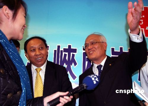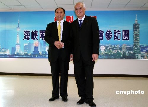 臺(tái)灣海峽兩岸航運(yùn)協(xié)會(huì)(“臺(tái)航會(huì)”)12月8日上午在臺(tái)北與來訪的海峽兩岸航運(yùn)交流協(xié)會(huì)(“海航會(huì)”)參訪團(tuán)座談。圖為海峽兩岸航運(yùn)交流協(xié)會(huì)理事長(zhǎng)胡漢湘和“臺(tái)航會(huì)”董事長(zhǎng)、長(zhǎng)榮海運(yùn)董事長(zhǎng)王龍雄在座談會(huì)中。胡漢湘說,兩岸航商爭(zhēng)先恐后要求參加首航,兩岸將同步行動(dòng),慶祝海運(yùn)首航。中新社發(fā) 劉舒凌 攝