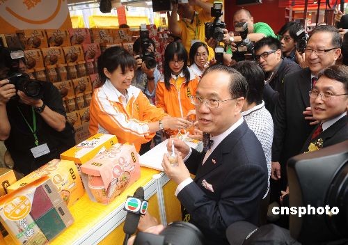 十二月十三日,香港第四十三屆工展會在維多利亞公園開幕,香港行政長官曾蔭權(quán)伉儷在會場內(nèi)參觀,并購買了五十包餅干禮包、五十份河粉禮包,以及一盒鮑魚面,消費(fèi)超過五千元。圖為曾蔭權(quán)在試食粉面。中新社發(fā) 鄧慶樂 攝