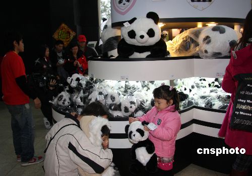 1月26日,大年初一。大陸贈臺大熊貓團團圓圓正式與臺灣民眾見面,圖為團團圓圓居住的臺北市動物園新光特展館熊貓商品展銷廳中,小朋友對絨毛熊貓玩偶愛不釋手。中新社發(fā) 陳立宇 攝