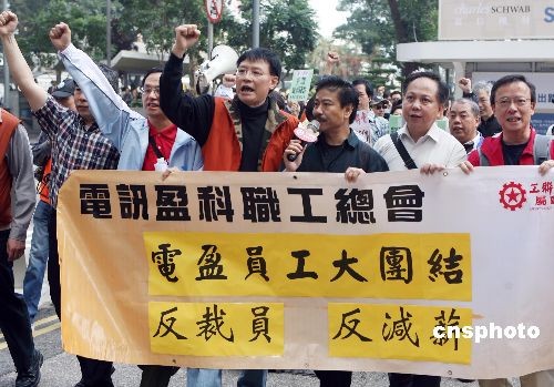 二月二十二日,約三百名電訊盈科員工在香港游行,抗議電盈在有盈利的情況下裁員,沒有盡社會(huì)責(zé)任。中新社發(fā) 武仲林 攝