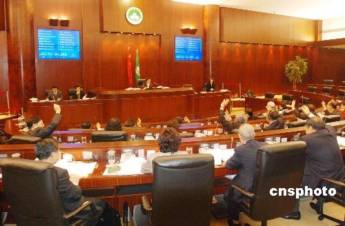 澳門(mén)立法會(huì)二月二十五日下午經(jīng)細(xì)則性討論后,高票通過(guò)了《維護(hù)國(guó)家安全法》。圖為法案通過(guò)后,議員們紛紛舉手發(fā)言。中新社發(fā) 畢永光 攝