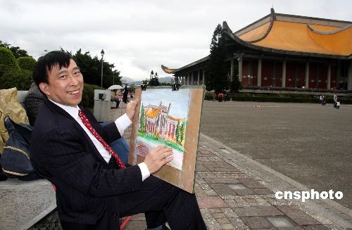 2月28日,應(yīng)臺(tái)北故宮博物院邀請(qǐng)前來(lái)臺(tái)灣參訪(fǎng)的上海博物館館長(zhǎng)陳?ài)凭趨⒂^臺(tái)北“國(guó)父紀(jì)念館”畫(huà)展后,忙里偷閑用隨身攜帶的畫(huà)具在紀(jì)念館前寫(xiě)生。中新社發(fā) 陳立宇 攝