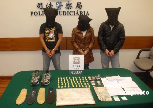 澳門警方三月八日、九日連破三起跨國(guó)販毒案,在澳門國(guó)際機(jī)場(chǎng)抓獲三名菲律賓籍毒販,他們分別通過體內(nèi)藏毒及行李、鞋子夾帶等方式帶入的海洛因二千九百克。中新社發(fā) 畢永光 攝