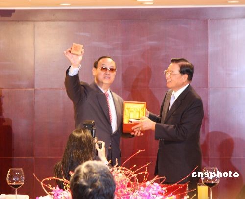 大陸海協(xié)會(huì)副會(huì)長(zhǎng)安民四月六日率“海協(xié)會(huì)經(jīng)貿(mào)交流考察團(tuán)”一行十四人抵達(dá)臺(tái)灣,開始為期七天的訪問(wèn)。臺(tái)灣海基會(huì)董事長(zhǎng)江丙坤在香格里拉臺(tái)北遠(yuǎn)東國(guó)際大飯店宴請(qǐng)安民一行。 中新社發(fā) 耿軍 攝
