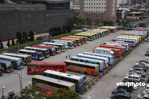 從今年三月起,到臺(tái)灣的大陸游客驟增,日抵人數(shù)甚至突破七千人。以大陸游客在臺(tái)灣停留六至十天計(jì),每天停留在臺(tái)灣的大陸游客有數(shù)萬(wàn)人,以致游覽車(chē)不夠用。圖為在大陸游客參觀點(diǎn)臺(tái)北101大樓的附近停車(chē)場(chǎng)停滿(mǎn)旅游團(tuán)車(chē)輛。臺(tái)灣觀光局四月二十六日緊急研商決定,供大陸游客使用的游覽車(chē)車(chē)齡由七年放寬到十年,以增加一千三百六十輛游覽車(chē)緩解車(chē)輛不足。中新社發(fā) 耿軍 攝