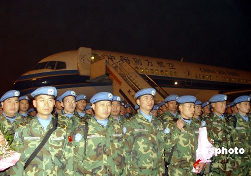 二十三日晚間二十一時(shí)許,中國赴蘇丹達(dá)爾富爾維和工兵先遣分隊(duì)一百三十五名官兵,在鄭州新鄭國際機(jī)場乘南航包機(jī)啟程,前往非洲。圖為啟程前,維和官兵同中外記者見面,并接受采訪。中新社發(fā) 李志全 攝