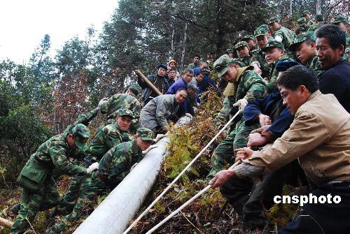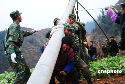 圖:中國廣西駐軍幫助冰凍災區(qū)搶修電力設備