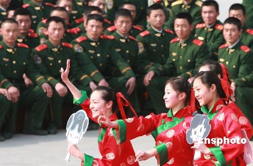2月22日,武警江蘇總隊文工團(tuán)演員為蘇州武警官兵表演舞蹈。當(dāng)日,武警江蘇總隊政治部文工團(tuán)組織“慰問抗雪救災(zāi)一線官兵及新戰(zhàn)友專場文藝巡演”之首場演出活動,在蘇州武警支隊新兵營訓(xùn)練場熱鬧開演。中新社發(fā) 蘇秀 攝