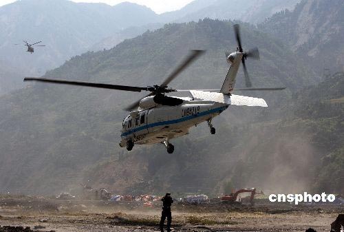 5月19日,中國空軍繼續(xù)高密度對四川省汶川大地震核心重災(zāi)區(qū)映秀鎮(zhèn)空運(yùn)救災(zāi)物資與部隊(duì)急需的飲用水等給養(yǎng)。雖然都江堰至映秀的“生命線公路”已經(jīng)打通,但是不斷的余震與降雨每天都會多次中斷車輛通行。中新社發(fā) 任晨鳴 攝