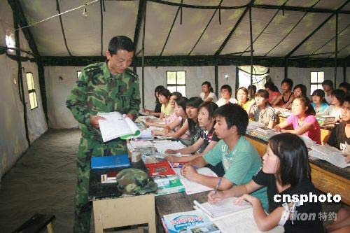 5月25日,蘭州軍區(qū)部隊官兵為文縣中廟鄉(xiāng)災區(qū)學生上課。地震使該鄉(xiāng)多所學校倒塌,學生無法正常上課。部隊從官兵中抽調大學生,在部隊駐地搭建帳篷,為100多名中小學生上課。中新社發(fā) 劉二銀 攝
