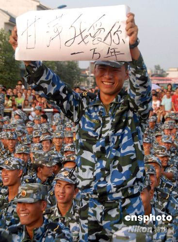 6月1日傍晚,海政文工團著名演員宋祖英、呂繼宏、甘萍、呂薇、閆學晶、霍勇、姚貝娜等來到四川什邡市師古鎮(zhèn),慰問奮戰(zhàn)在抗震救災一線的海軍陸戰(zhàn)隊的勇士們。演員們的出現(xiàn),讓奮戰(zhàn)了半個月的官兵們心情頓時開朗,露出久違的笑容。中新社發(fā) 姚澤勇 攝