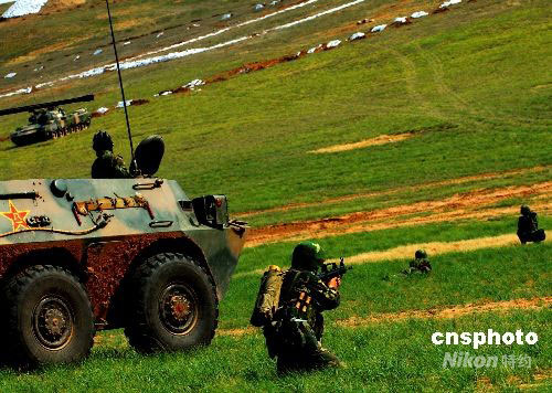 9月中下旬,參加“礪兵-2008”的濟(jì)南軍區(qū)某機(jī)械化步兵旅,在塞北荒原綜合訓(xùn)練基地進(jìn)行實(shí)兵立體對(duì)抗演練。近百輛戰(zhàn)車(chē)和坦克兵分多路向“敵”陣地發(fā)起攻擊。中新社發(fā) 張振興 攝