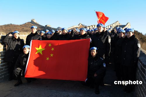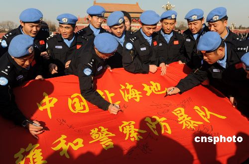 2009年1月1日,中國第八支赴海地維和警察防暴隊(duì)在北京八達(dá)嶺長城和天安門廣場舉行維和宣誓暨簽名活動(dòng),激勵(lì)全體隊(duì)員牢記維和職責(zé),苦練精兵,為維護(hù)世界和平做出積極貢獻(xiàn)。該支維和警察防暴隊(duì)以山東公安邊防總隊(duì)為主組建,目前正在河北廊坊中國維和警察培訓(xùn)中心接受綜合培訓(xùn),將于今年4月份出征海地執(zhí)行維和任務(wù)。中新社發(fā) 由永懷 攝