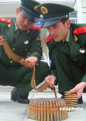 4月27日,臺(tái)州邊防官兵展示收繳的機(jī)槍子彈。4月21日,某施工隊(duì)在浙江省臺(tái)州市大陳島原機(jī)場(chǎng)附近施工時(shí),從地下挖出一個(gè)子彈箱,內(nèi)裝有8成新機(jī)槍子彈250發(fā)。目前,該批子彈已被大陳邊防派出所收繳封存,初步分析為解放戰(zhàn)爭(zhēng)時(shí)期遺留。中新社發(fā) (郟策) 攝