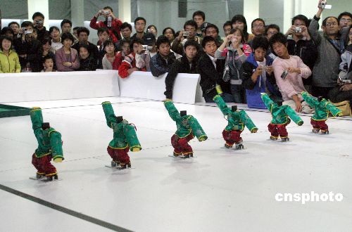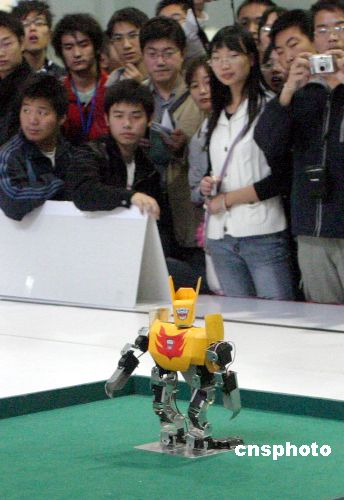 10月26日,為期3天的2007“銀泉杯”中國機器人大賽暨Robo Cup中國公開賽在濟南大學科技園開幕。據了解,本次大賽共有來自國內外的400多支隊伍1000余名選手參賽,大賽設置了34個比賽項目,包括Robo Cup機器人比賽、FIRA機器人比賽、空中機器人比賽、水中機器人比賽、舞蹈機器人比賽及雙足競步機器人比賽等多種比賽類型,是歷屆中國機器人大賽中比賽種類最多和最全的一次。中新社發(fā) 龔輝 攝