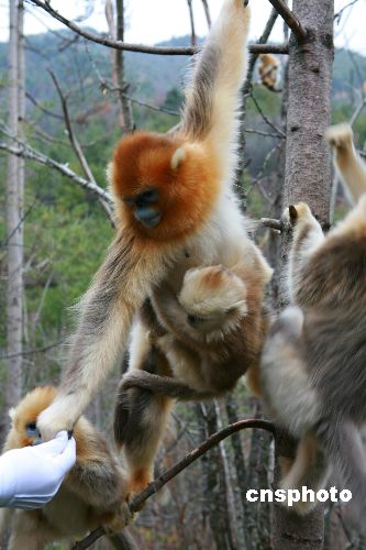 圖為11月1日,拍攝于湖北省神農(nóng)架大龍?zhí)吨信c人和諧相處的金絲猴。據(jù)了解,在金絲猴的食譜中,植物種類多達(dá)172種。為讓金絲猴安度寒冬,科研人員嘗試著讓金絲猴接受別的食物。經(jīng)過5個(gè)月的磨合,蘋果成了神農(nóng)架金絲猴的美食。神農(nóng)架給川金絲猴人工補(bǔ)食實(shí)驗(yàn)的成功,既是對(duì)川金絲猴進(jìn)行保護(hù)的寶貴經(jīng)驗(yàn),也是中國珍稀野生動(dòng)物保護(hù)與研究的一個(gè)重大突破。