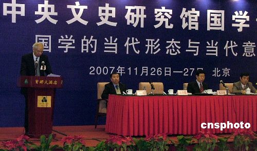 經(jīng)中國國務(wù)院批準,中央文史研究館國學論壇二十六日在北京舉行。論壇主題是:國學的當代形態(tài)和當代意義。共有全國文史研究館館員以及中國社會科學院、北京大學、中國人民大學國學專家,香港、澳門、臺灣地區(qū)專家學者五十人出席。中新社發(fā) 徐長安 攝
