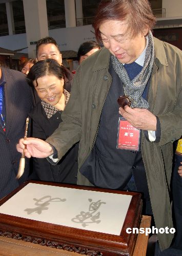 第八屆中國民間文藝山花獎頒獎典禮于11月29日在蘇州市陽澄湖畔相城區(qū)舉行,相城區(qū)也成為山花獎永久評獎基地。具有深厚歷史文化底蘊、以民間文藝“相城十絕”著稱的相城區(qū),還將被中國民間文藝家協(xié)會授予“中國民間藝術(shù)之鄉(xiāng)”榮譽稱號。圖為中國文聯(lián)副主席、中國民間文藝家協(xié)會主席馮驥才,用“相城十絕”之一的蘇州御窯金磚現(xiàn)場寫字。中新社發(fā) 邱勇 攝