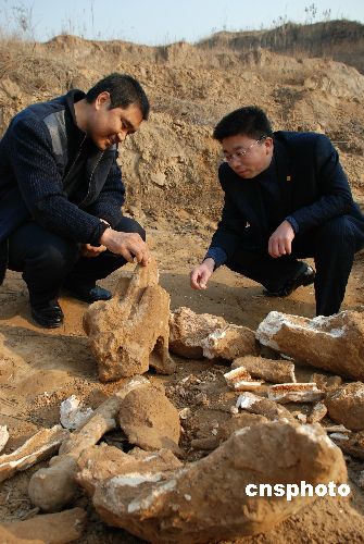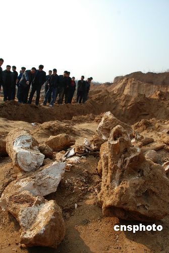 12月5日,山東淄博周村區(qū)王村鎮(zhèn)西道村磚廠挖掘出疑似“恐龍”的巨型動物骨骼化石。當(dāng)日10點(diǎn)48分,正在淄博周村區(qū)王村鎮(zhèn)西道村磚廠施工的司機(jī)小郝,給村主任劉道新打電話說“挖掘機(jī)在工作時挖到了大量的化石,很像是動物的骨骼!痹诂F(xiàn)場進(jìn)行保護(hù)的彭陽派出所的所長于成杰介紹說,這次挖到的化石很大,露出來的化石有6米多長,呈圓柱狀細(xì)端的直徑有18-19厘米,粗端的直徑有30-40厘米。其動物骨格的特征非常明顯,其體積顯然比大象要大的多,與史前動物“恐龍”骨骼化石極其相似。中新社發(fā) 梁寶海 攝