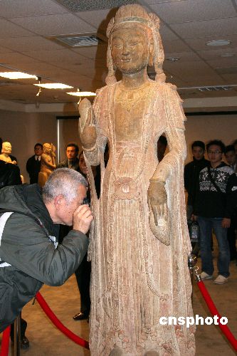 一月四日,一位觀眾在臺(tái)灣中華皇家藝術(shù)博物館近距離欣賞首次展出的該館鎮(zhèn)館之寶——國(guó)寶級(jí)文物“大勢(shì)至菩薩”石像。由該館推出的“中華瑰寶系列——宋朝漢白玉十八羅漢特展”當(dāng)日在臺(tái)北開(kāi)展,造型中西合壁、保存完好,被認(rèn)為是全球唯一保存最完整的“大勢(shì)至菩薩”塑像也同期與觀眾首度見(jiàn)面。據(jù)考證,這尊高一百九十八厘米、石灰石貼金敷彩“大勢(shì)至菩薩”為東魏至北齊年間作品,距今約一千六百年至一千四百年。中新社發(fā) 孫自法 攝