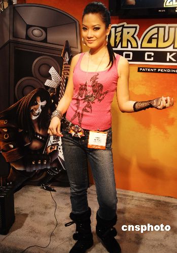一月九日,一位亞裔樂手在美國拉斯維加斯舉辦的世界最大消費(fèi)電子產(chǎn)品展上,表現(xiàn)數(shù)字隱形電吉它的奇妙之處,她只需模擬常規(guī)動作就會奏出動聽的電子樂。中新社發(fā) 賈國榮 攝