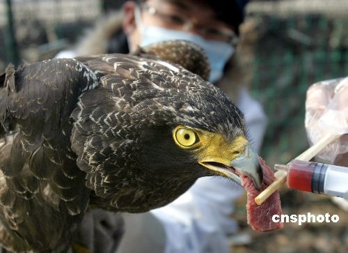 2月27日下午,浙江蒼南“綠眼睛”野生動(dòng)物救助站,志愿者正照顧一只受傷的珍稀動(dòng)物蛇雕。這只蛇雕是在浙江永嘉嶺頭鄉(xiāng)被發(fā)現(xiàn)的,送到救助站已有3天,它身長(zhǎng)約70厘米,兩翅展開(kāi)約1.5米,體重1.6公斤。待它身體狀態(tài)恢復(fù)后,將會(huì)被放歸大自然。