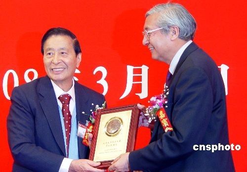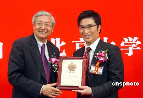 圖為北京大學(xué)校長(zhǎng)許智宏向李家誠(右)頒發(fā)名譽(yù)校董紀(jì)念牌。