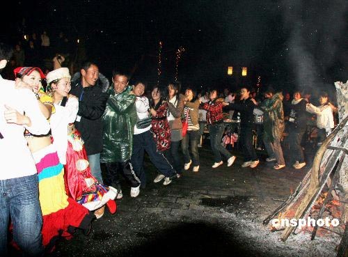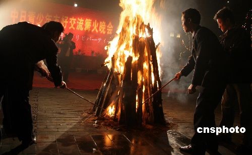 3月12日晚,正在重慶永川交流訪問的日本高中生訪華代表團與永川中學高中生攜手舉辦一場篝火晚會,中日兩國高中生圍繞著篝火一起踏歌起舞。中新社發(fā) 孫自法 攝