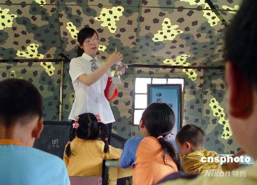 大學(xué)生志愿者在災(zāi)區(qū)救助中心為孩子上課