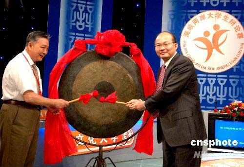 7月21日,福建省科學(xué)技術(shù)協(xié)會主席、中科院院士吳新濤(左)與臺灣中華青年交流協(xié)會理事長張昌吉為第七屆海峽兩岸大學(xué)生辯論賽開賽鳴鑼。當(dāng)日,第七屆海峽兩岸大學(xué)生辯論賽在福州開賽,來自海峽兩岸共十六支高校代表隊參加角逐。中新社發(fā) 劉可耕 攝