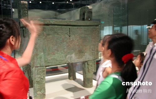 8月11日,“國寶”級文物——司母戊大方鼎在中國科技館新館的中國古代發(fā)明創(chuàng)造文物展上展出,成為備受觀眾矚目的焦點展品之一。中新社發(fā) 孫自法 攝