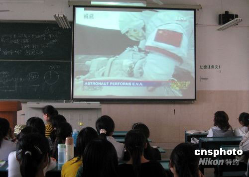 2008年9月27日下午,安徽師范大學學生在教室集體觀看宇航員太空行走直播。北京時間9月27日下午四點五十九分,神舟七號航天員翟志剛成功出艙,實現(xiàn)中國歷史上第一次太空行走。中新社發(fā) 劉淮宇 攝
