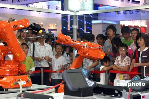 第十屆中國國際高新技術(shù)成果交易會(huì)10月12日在深圳正式開館迎客。在上屆首次設(shè)立機(jī)器人展備受追捧的基礎(chǔ)上,本屆高交會(huì)機(jī)器人專展在展出規(guī)模和層次上又有提高,以工業(yè)機(jī)器人、民生機(jī)器人、特種機(jī)器人、青少年機(jī)器人等多部分展示來自兩岸三地,以及日本等國的中外著名大學(xué)、研究機(jī)構(gòu)、高科技企業(yè)在該領(lǐng)域的成果。圖為兩臺六軸機(jī)器人在乒乓球上表演寫字“手藝”,吸引著觀眾。中新社發(fā) 凌風(fēng) 攝