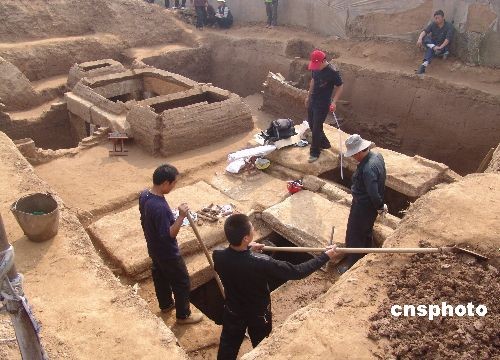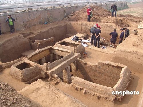 10月15日,考古人員正在挖掘漢墓。近日,在山東省沂南縣磚埠鎮(zhèn)發(fā)現(xiàn)占地約3000平方米的東漢家族墓葬群,經(jīng)過上級(jí)部門批準(zhǔn),考古人員對(duì)其中兩座墓穴進(jìn)行了搶救性科學(xué)挖掘,目前已經(jīng)發(fā)掘出土8件釉陶壺在內(nèi)的大量文物,墓內(nèi)石壁上有多幅畫像,清晰可見。中新社發(fā) 杜昱葆 攝