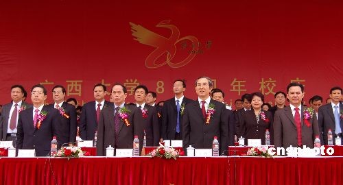 11月8日,中國(guó)廣西壯族自治區(qū)歷史最悠久、規(guī)模最大的高等學(xué)府——廣西大學(xué)舉行建校80周年慶典大會(huì),該校校友、全國(guó)政協(xié)副主席李兆焯出席并題詞,中共廣西壯族自治區(qū)委員會(huì)書記郭聲琨、廣西壯族自治區(qū)主席馬飚等官員、廣西大學(xué)海內(nèi)外校友、學(xué)生兩萬(wàn)多人出席慶典。廣西大學(xué)首任校長(zhǎng)是和蔡元培齊名的著名科學(xué)家、教育家馬君武,當(dāng)時(shí)有“北蔡南馬”之稱。廣西大學(xué)成立80年來(lái),已培養(yǎng)近20萬(wàn)名人才,該校是21世紀(jì)中國(guó)重點(diǎn)建設(shè)的百所高校之一。中新社發(fā) 劉萬(wàn)強(qiáng) 攝