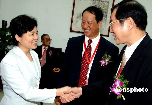 圖為出席該學院建校五十周年慶祝大會的中共福建省委常委、福建省副省長兼中共福建省委教育工委書記陳樺(左一)親切問候臺灣中國醫(yī)藥大學校長黃榮村。