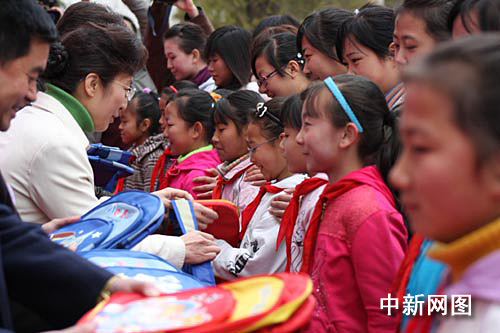 甘肅省人口委、共青團甘肅省委、蘭州市政府官員為結對幫教的女大學生志愿者頒發(fā)證書,為女童贈送書包等。