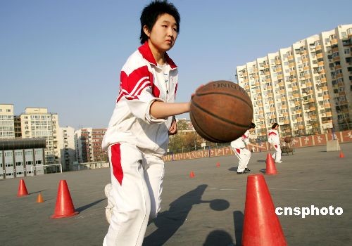 11月21日,北京中學(xué)生在體育課上積極練習(xí)籃球運(yùn)球往返跑,應(yīng)對中考體育考試科目變化。近日,2009年中考體育方案出臺,明年中考體育總分仍為30分,并將首次實(shí)現(xiàn)全市統(tǒng)一考試項(xiàng)目、統(tǒng)一成績評定標(biāo)準(zhǔn)、統(tǒng)一考試規(guī)程和統(tǒng)一考試時間的“四統(tǒng)一”。在考試項(xiàng)目上,男女生都必考的立定跳遠(yuǎn)將就此退出中考,取而代之的是繞標(biāo)志物15米往返籃球運(yùn)球。中新社發(fā) 富田 攝