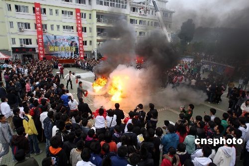 為汲取上海商學(xué)院“11.14”重大火災(zāi)事故教訓(xùn),11月22日上午,湖北三峽大學(xué)舉行了消防安全宣傳活動。組織學(xué)校師生開展了滅火逃生疏散演練,現(xiàn)場還對收繳的1000余支“熱得快”進(jìn)行銷毀,提高師生的消防安全意識。中新社發(fā) 方佩 攝