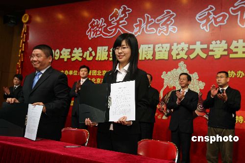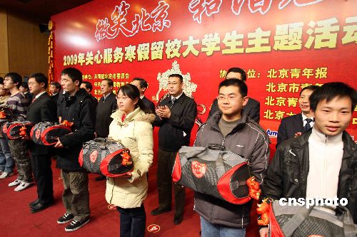 一月十日,北京啟動“微笑北京 和諧社會”關心服務寒假留校大學生主題活動,其主要內容包括關心地震災區(qū)、邊遠地區(qū)和經濟困難大學生,提供見習崗位,幫助同學們利用寒假進行就業(yè)創(chuàng)業(yè)見習。為留校學生贈送兩千個愛心大禮包。中新社發(fā) 任海霞 攝
