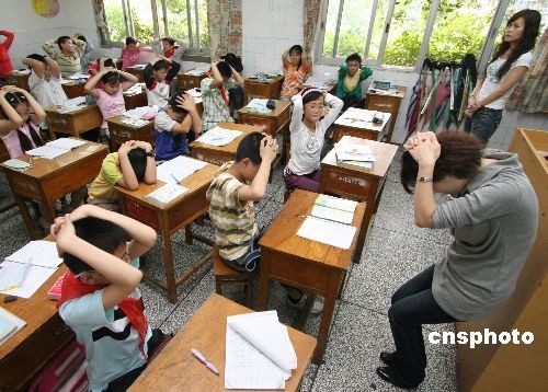 5月12日,重慶江北華新實(shí)驗(yàn)小學(xué)的孩子們?cè)趯W(xué)習(xí)災(zāi)害發(fā)生時(shí)的緊急避難知識(shí)。當(dāng)日是首個(gè)“防災(zāi)減災(zāi)日”,重慶各學(xué)校紛紛進(jìn)行防災(zāi)避難課和災(zāi)害發(fā)生時(shí)的緊急避難及人員疏散演練,提高孩子們?cè)跒?zāi)害發(fā)生時(shí)的自我保護(hù)意識(shí)和掌握各種臨時(shí)避難方法。中新社發(fā) 賀終榮 攝