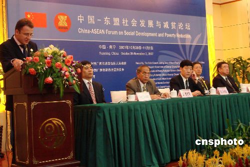 十月三十日,由中國國務(wù)院扶貧辦和廣西壯族自治區(qū)人民政府共同舉辦的中國-東盟社會發(fā)展與減貧論壇在廣西南寧正式開幕。中國和東盟十國主管扶貧工作的高級官員、社會發(fā)展和減貧領(lǐng)域的專家學(xué)者及企業(yè)家等一百余人就“推進(jìn)區(qū)域社會發(fā)展與減貧交流合作”主題進(jìn)行研討。中新社發(fā) 黃艷梅 攝