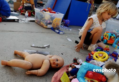 圖為一位小災(zāi)民在圣地牙哥高通體育館臨時(shí)避難場(chǎng)設(shè)立的兒童樂(lè)園里。