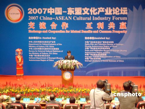 十一月八日,為期兩天的第二屆中國(guó)-東盟文化產(chǎn)業(yè)論壇在廣西南寧開幕。中國(guó)、文萊、柬埔寨、印尼、老撾、馬來西亞、緬甸、菲律賓、新加坡、泰國(guó)、越南的文化官員及專家出席論壇,論壇將圍繞“中國(guó)與東盟各國(guó)文化產(chǎn)業(yè)資源的保護(hù)開發(fā)與合理利用”、“中國(guó)與東盟國(guó)家促進(jìn)文化產(chǎn)業(yè)發(fā)展的政策與措施”、“中國(guó)—東盟自由貿(mào)易區(qū)框架下文化產(chǎn)業(yè)合作與發(fā)展的前景”、“推動(dòng)泛北部灣經(jīng)濟(jì)合作區(qū)文化產(chǎn)業(yè)的共同繁榮與發(fā)展”等議題展開研討。中新社發(fā) 曾德軍 攝