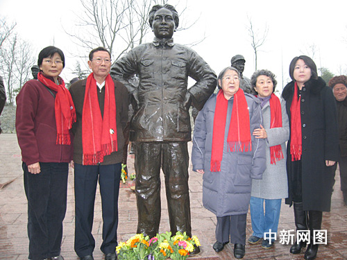 李敏(右三)、孔東梅(右一)、周秉德(周恩來侄女,右二)、周秉鈞(周恩來侄子,左二)、劉軍鷹(周恩來侄媳左一)在毛澤東塑像前合影;蠢柘 攝