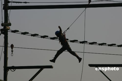圖為中國(guó)士兵飛越斷橋。