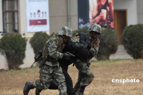 圖為訓(xùn)練中,“恐怖分子”被特戰(zhàn)隊(duì)員捕獲。